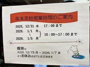 新着情報 -What's New- HOME 新着情報 > ~ 年末年始 営業時間のお知らせ ~ ~ 年末年始 営業時間のお知らせ ~ 2025年12月09日 プチローズでは、一年最後のメインイベントに向けて、スタッフ一丸となって、毎日美味しいケーキ造りに励んでおります。皆様のご来店をお待ちしております♪ 年末年始の営業時間をお知らせさせていただきます。 2025年12月31日(水) ~17時まで 2026年1月1日(木)~1月5日(月) 10時開店~17時閉店 喫茶コーナーは、2025年12月15日(月)~2026年1月7日(水)迄休業とさせていただきます。 “あたしいおいしさづくりに、 腕を振るいとびっきりの舌つづみを貴方に…。” << 前の「~ サンタ村今年も開村です 2025 ~ 」へ 次の「~ クリスマスの準備はお済でしょうか? ~」へ >> Cake Gift 焼菓子 デコレーションケーキ Wedding 今月のおすすめ プチローズ株式会社 -Petit Rose- >>地図を拡大表示する。 〒480-0102愛知県丹羽郡扶桑町高雄宮島21 フリーダイヤル 0120-285-222 会社案内 お問い合わせ よくある質問 採用情報