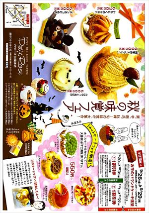 秋の味覚フェア定番の、プチローズ自慢のタルトにハロウィンおばけケーキ、カスタードマロン、かぼちゃに和栗も、秋の味覚を多数ご用意して、ご来店お待ちしております。